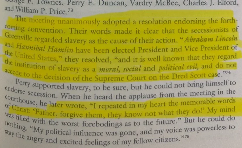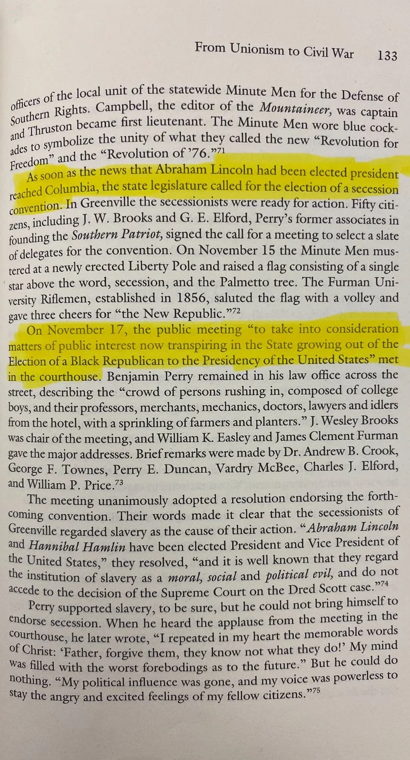 “And it is well known that they regard the institution of slavery as a moral, social and political evil.” - Greenville, South Carolina City Government on Abraham Lincoln and Hannibal Hamlin being newly elected President & Vice President. (1860)